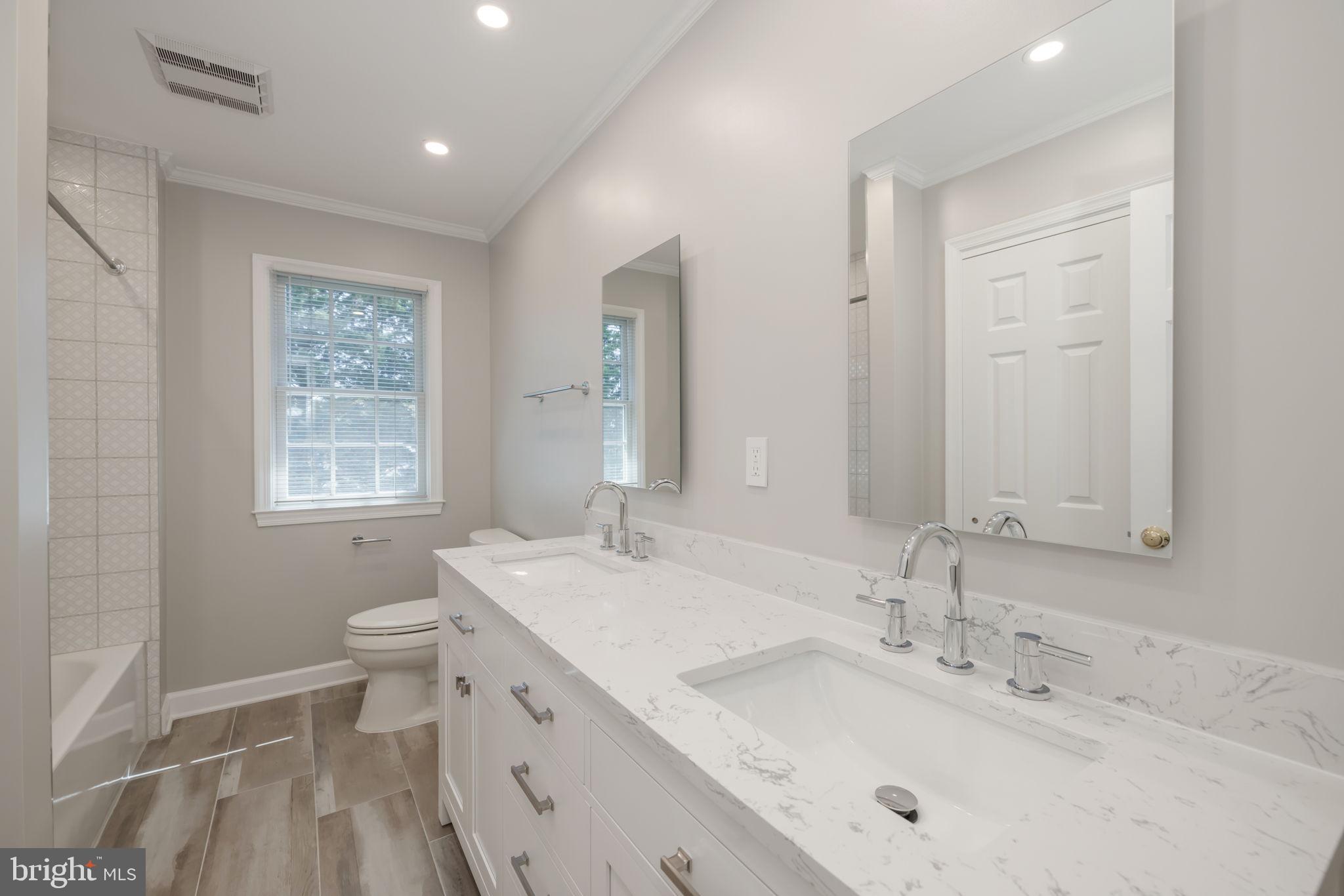 Upstairs, the primary suite provides a peaceful retreat with a spa-like ensuite bathroom, while three additional bedrooms and a remodeled full bathroom offer plenty of space for rest, work, or guests. The two-car garage includes custom cabinetry and shelving for excellent storage and organization. Conveniently located near top-rated schools, shopping, dining, parks, and just a short drive to Washington, DC, this stunning rental combines sophisticated living with everyday comfort and the added bonus of a child-friendly, cul-de-sac setting.