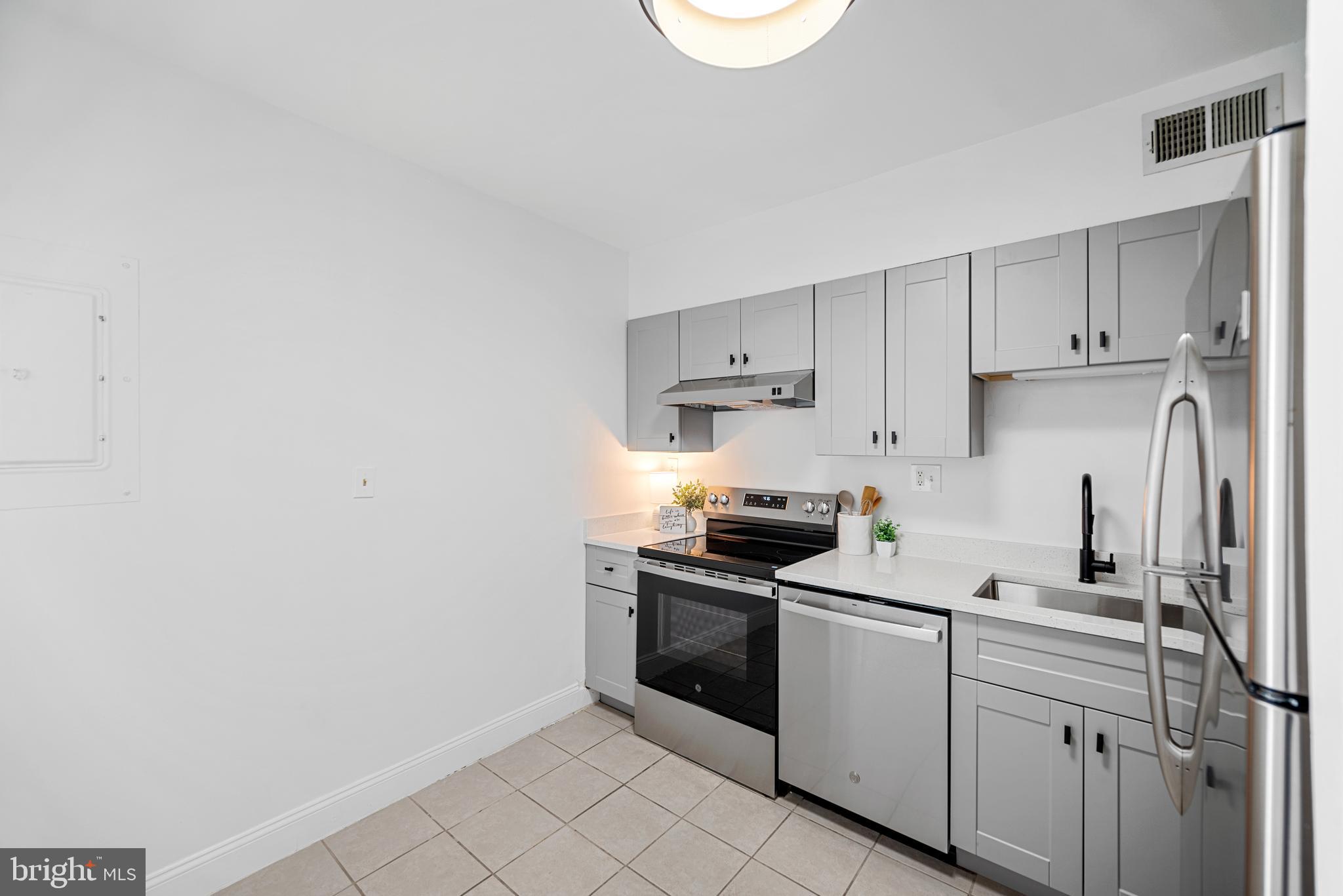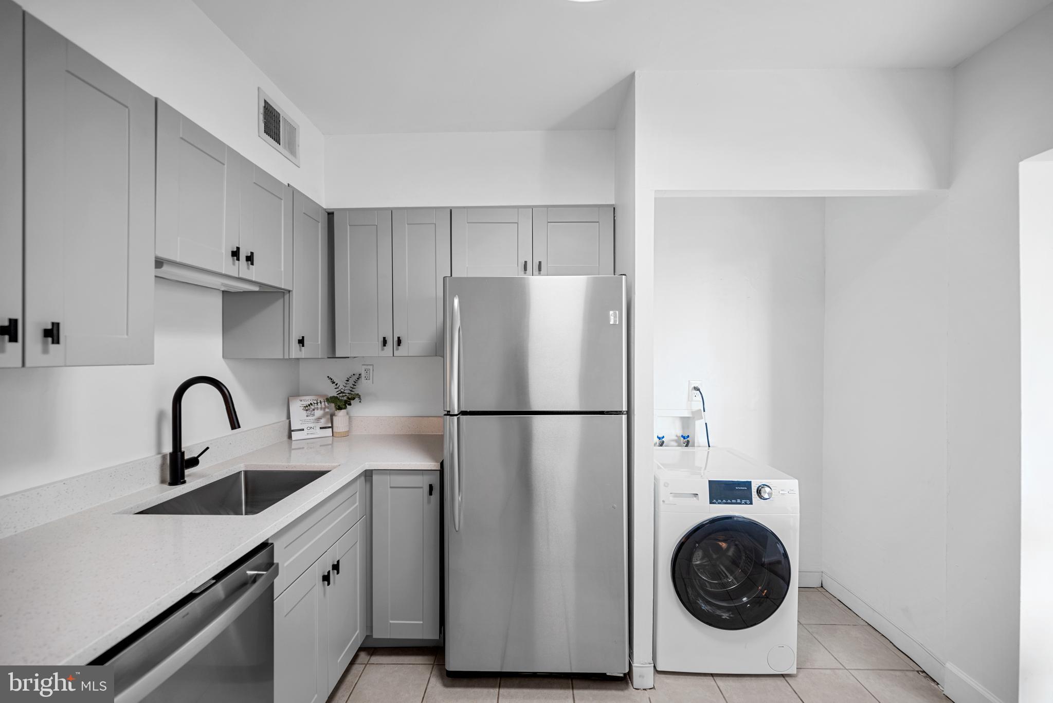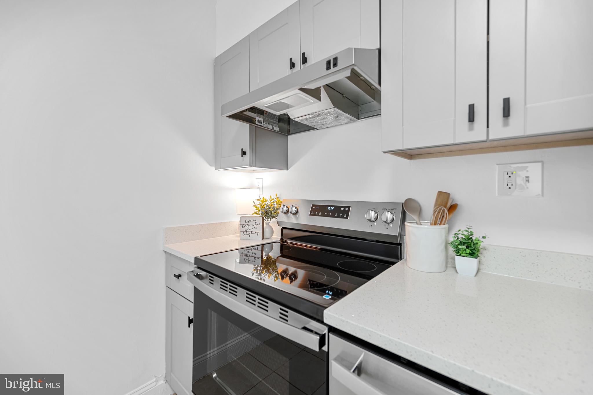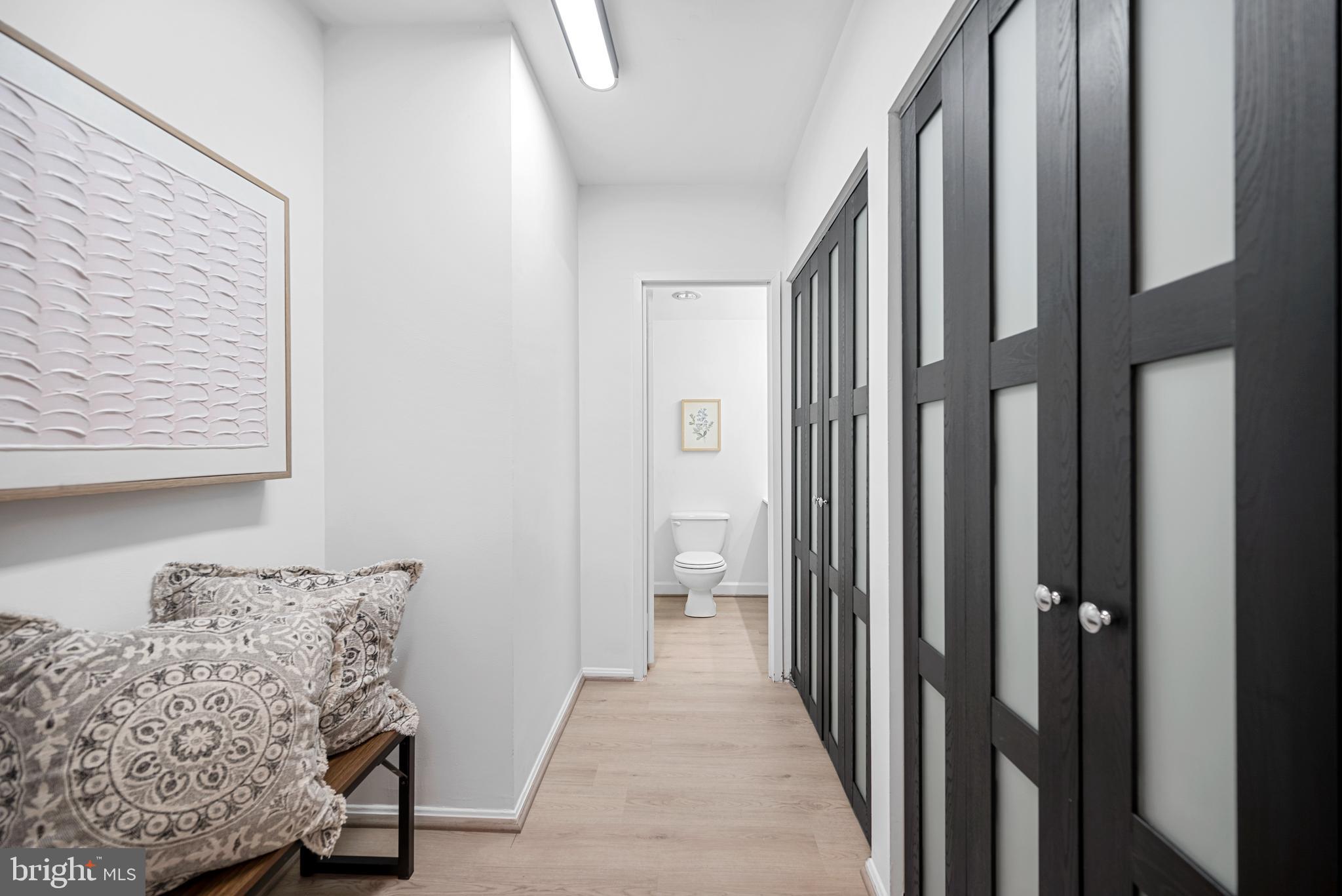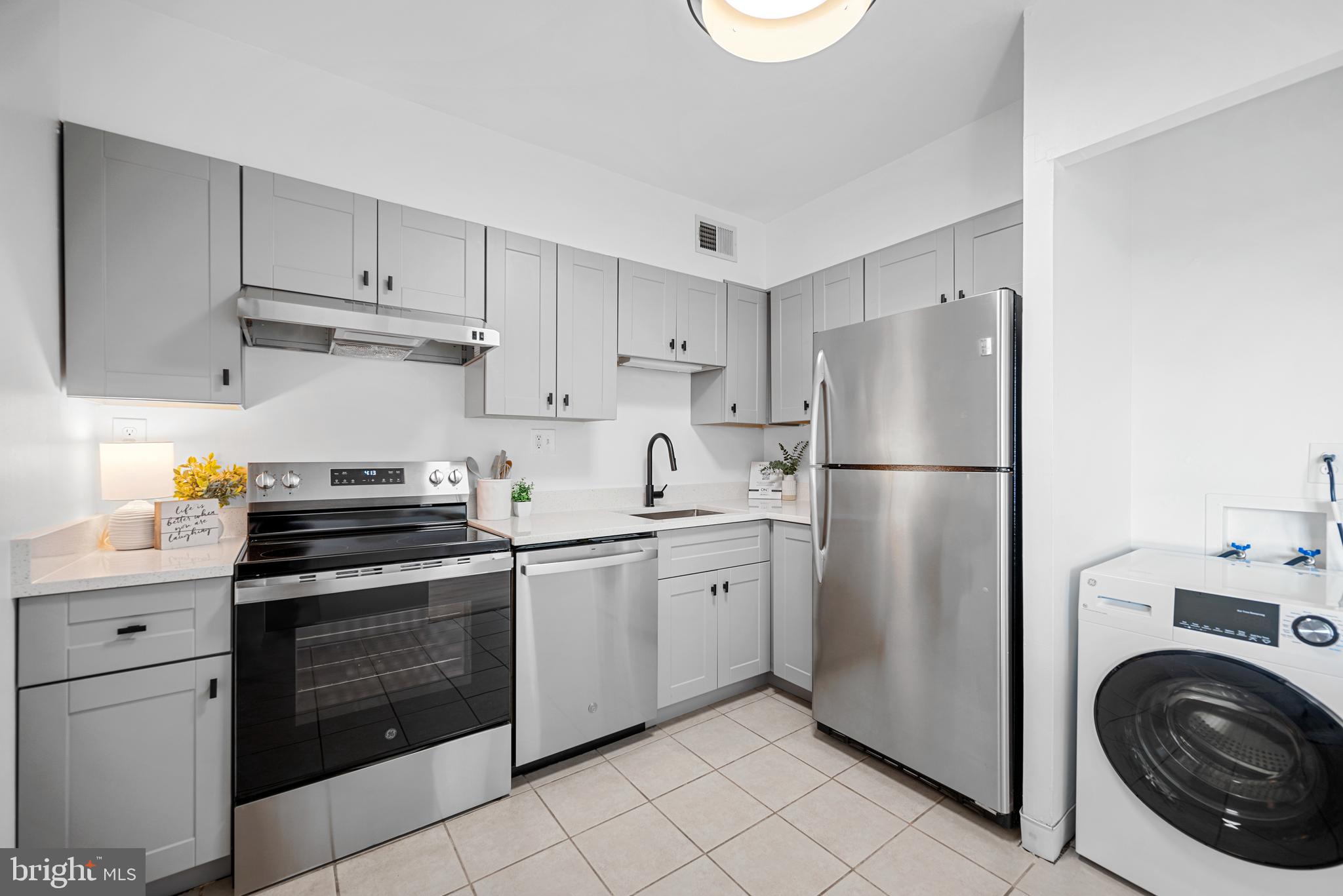 The kitchen is thoughtfully designed with elegant Shaker-style cabinets, stainless steel appliances, and a breakfast bar that connects seamlessly with the living space. A set of contemporary sliding doors leads to the peaceful bedroom, while the updated full bathroom is easily accessible from the hallway. You'll also enjoy the convenience of in-unit laundry, generous closet space, an additional storage unit, and a reserved parking spot.